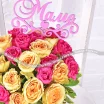 Стандартный: роза кустовая желтая (кремовая) - 6 шт., роза кустовая розовая - 5 шт., декоративная зелень, оазис, топпер "Маме", коробка.